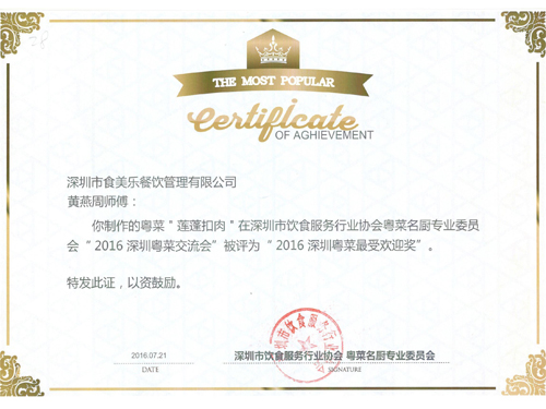 我司研發(fā)部丁總帶隊,攜大廚蘇玉洪、黃燕周參加了由深圳市飲食服務行業(yè)協(xié)會粵菜名廚專業(yè)委員會舉辦的“2016深圳粵菜交流會”。我司大廚蘇玉洪制作的"八卦杏仁豆腐"、黃燕周制作的“如意蝦燈”及“蓮蓬扣肉”被評為2016年深圳粵菜金獎。